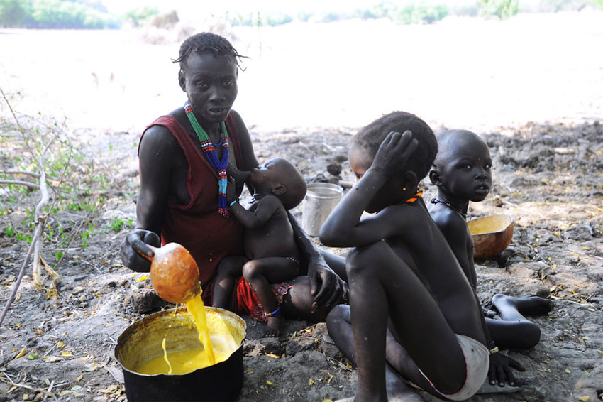A mother prepares a meal for her children on the outskirts of Fertait, a village in Jonglei which was burned during the ethnic clashes. UN Photo/I. Billy
