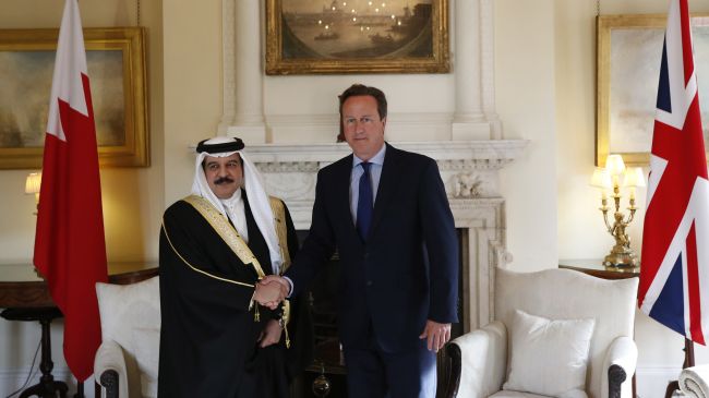 **David Cameron (R) shakes hands with Bahrain’s King Hamad bin Isa al-Khalifa during their meeting at 10 Downing Street in central London on August 23, 2012 | PressTV.