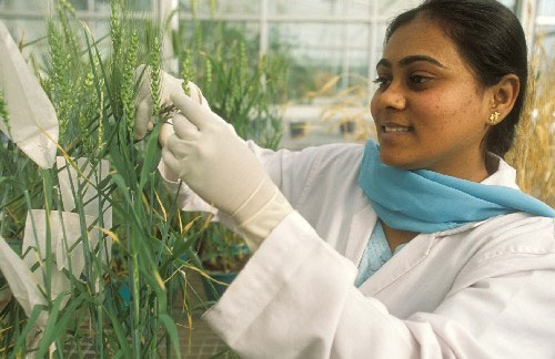 A scientist at a greenhouse of the Indian Agricultural Research Institute, New Delhi, doing research on a particular variety of wheat. Photo: FAO/Jon Spaull