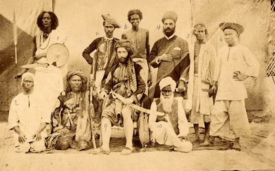 Various ethnic and religious types present in the Middle East, 19th century | A post card from the 19th century showing the rich mix of ethnic and religious types in the Indian subcontinent 1. unknown; 2. Maratha 3. unknown; 4. Zoroastrian; 5. Jew; 6. Chinese; 7. unknown; 8. unknown; 9. Arab (sitting in the middle on a chair); 10. Sikh | Public Domain