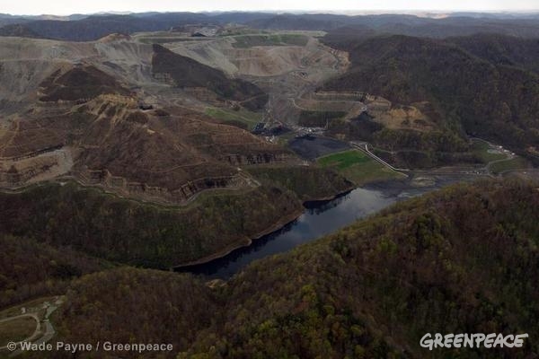 Aerial photograph documenting mountain top removal mining atop Cherry Pond Mountain. 03/30/2012 © Wade Payne / Greenpeace