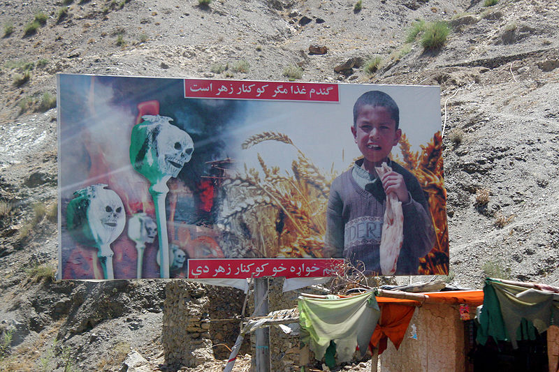 **Anti-poppy propaganda poster. An approximate translation of the text is “Poppies are the crop of death. Grow wheat instead so children can eat and live” | Author: Todd Huffman | Source: originally posted to Flickr as No Poppies | Wikimedia Commons.