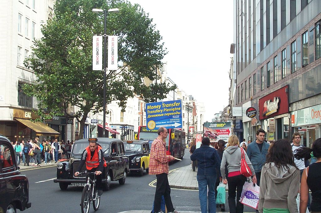 **Remittance advertising in Oxford Street, London with Polish and Russian slogans | Source: Kaihsu Tai | Author: Kaihsu Tai | Wikimedia Commons.