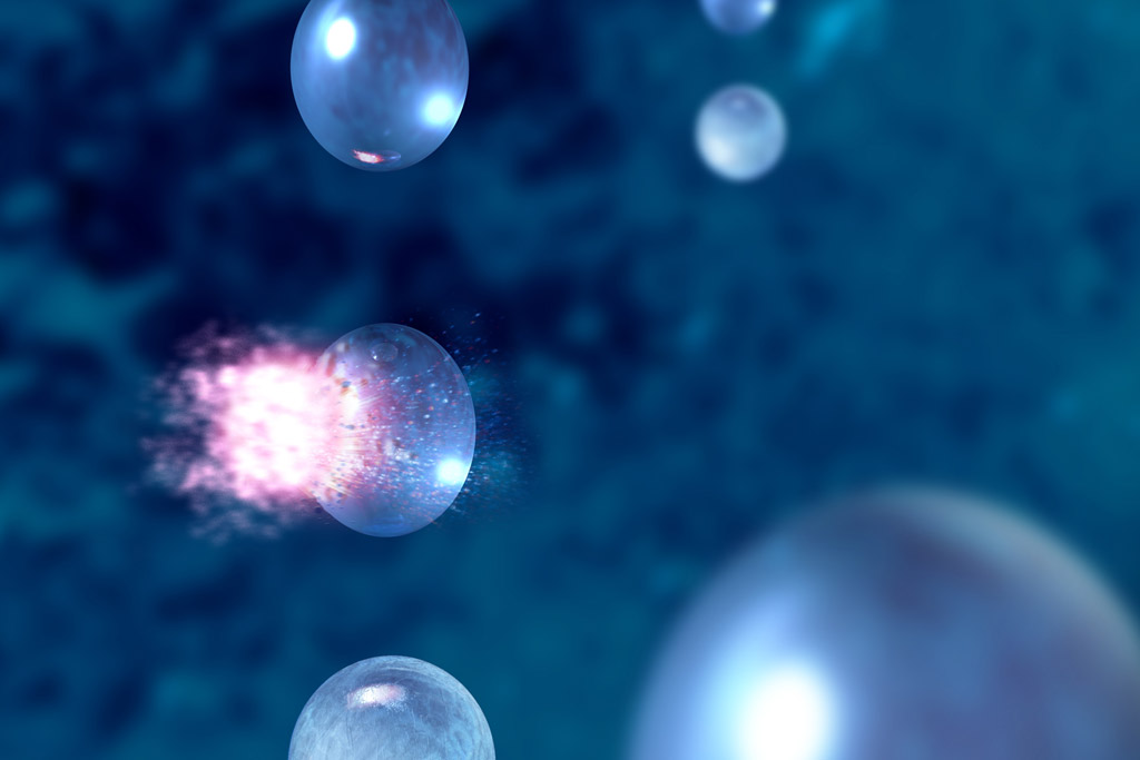 An X-ray laser pulse at SLAC’s Linac Coherent Light Source probes a supercooled water droplet (center, left). The speed and brightness of the X-ray pulses allowed researchers to study water molecules in the instant before freezing. Photo: SLAC/Greg Stewart