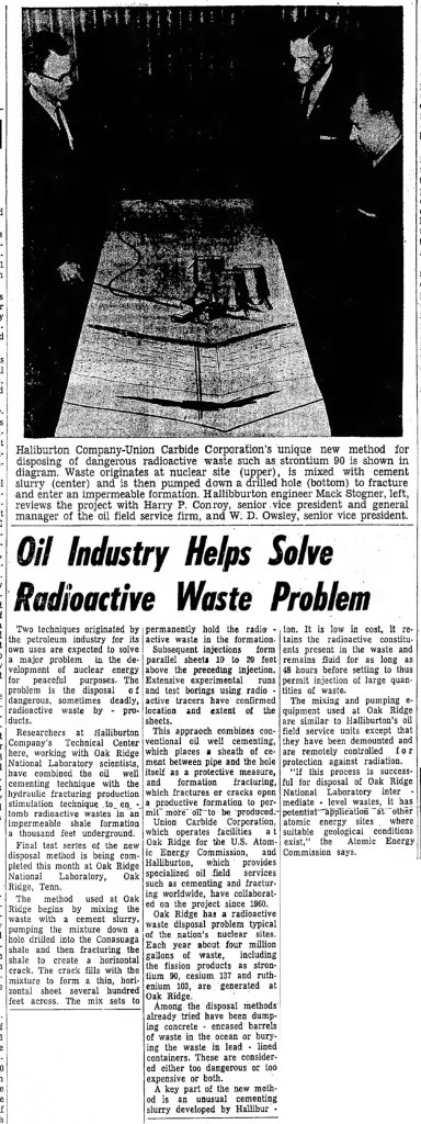 Teaming up with the U.S. Government and Union Carbide Corp., who operate nuclear materials divisions at the Oak Ridge National Laboratories in Tennessee, Halliburton was then credited with “solving” the radioactive waste problem faced by America’s secretive nuclear industry. Dumping waste via fracking had apparently been going on since 1960, according to the reports, but was only made public here in 1964.