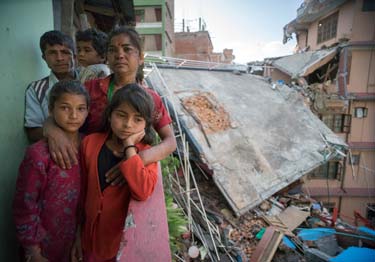© UNICEF Nepal/2015/Sokol | Ganga and Jamuna (front left and right) with their mother, father and 4-year-old brother, Anju, at what was their home.