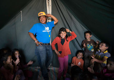 © UNICEF Nepal/2015/Sokol | Nepalese actor Rumba is a volunteer at the child-friendly space. Jamuna joins him in a dance.