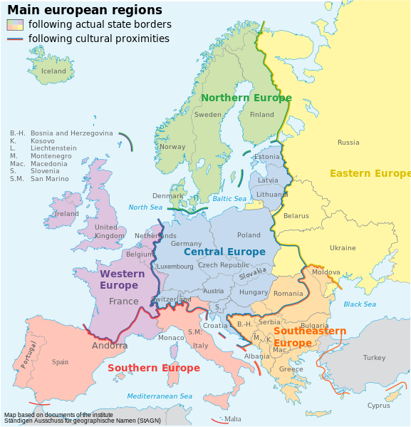 ***Subdivision of Europe according to the cultural criteria | Author: Grossgliederung_Europas.svg: NordNordWest | derivative work: Dch (talk) | Source: Grossgliederung_Europas.svg | Wikimedia Commons