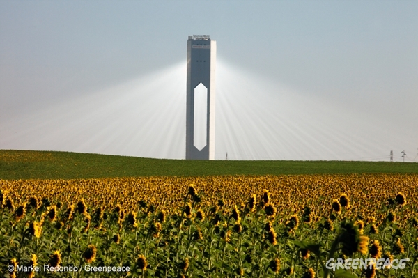 Looking more like a enlightened being bursting from a holy church, this tower which sits at Sanlucar la Mayor outside Seville, Spain can provide electricity for up to 6,000 homes. | Credit: Markel Redondo/Greenpeace