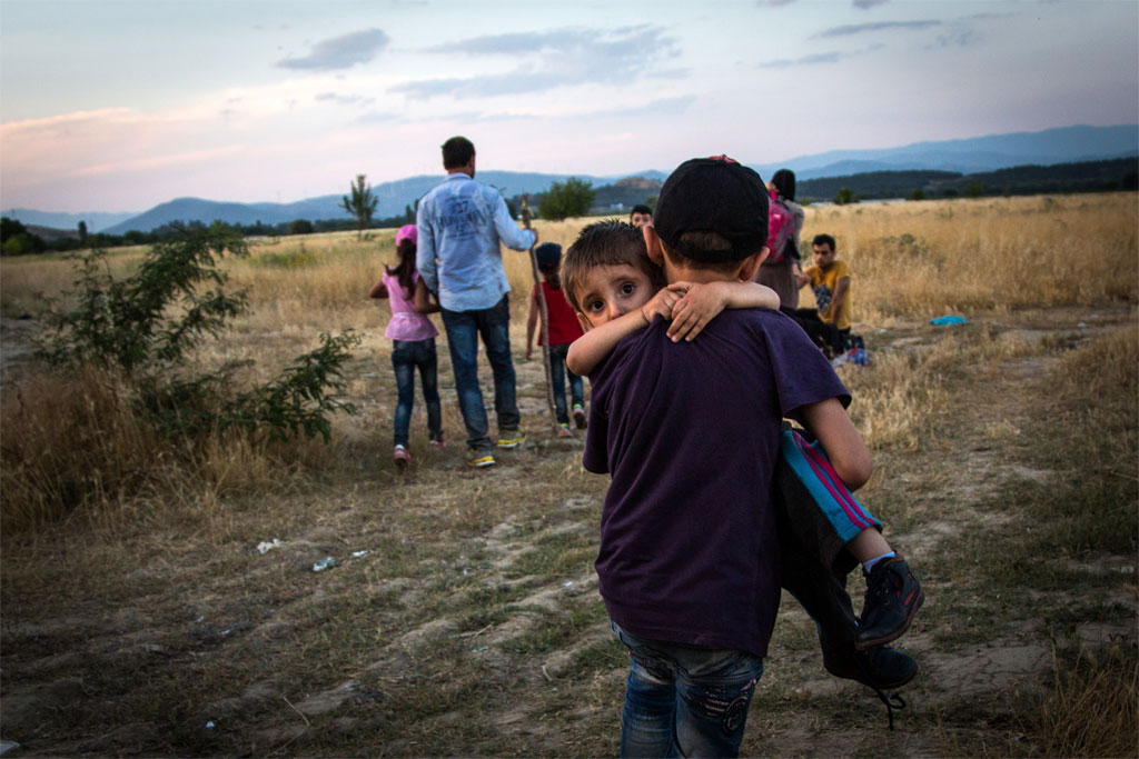 A young Syrian refugee carries his brother across the border between Greece and the former Yugoslav Republic of Macedonia (FYROM), near Eidomeni, Greece, in June 2015. Photo: UNHCR/A. McConnell