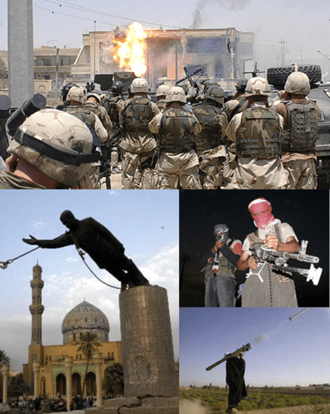 **Clockwise from top: Delta Force of Task Force 20 alongside troops of 3rd Battalion, 327th Infantry Regiment, at Uday Hussain and Qusay Hussein’s hideout.; Iraqi insurgents in northern Iraq; an Iraqi insurgent firing a MANPADS; the toppling of the Saddam Hussein statue in Firdos Square.| 11 March 2013 | Author: Futuretrillionaire | Creative Commons Attribution-Share Alike 3.0 Unported license. | Wikimedia Commons