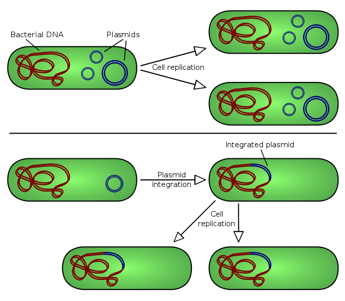 ***There are two types of plasmid integration into a host bacteria: Non-integrating plasmids replicate as with the top instance, whereas episomes, the lower example, can integrate into the host chromosome. | Author: User:Spaully | Creative Commons Attribution-Share Alike 2.5 Generic license. | Wikimedia Commons