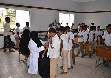 © UNICEF Yemen/2016/Al-Batati | Entesar Saeed Bamoumen is a midwife in the Roukeb district of Mukalla – and a vital force in the community. Here, primary school students in the district queue for her to administer vaccinations. During campaigns, she can vaccinate some 375 children per day.