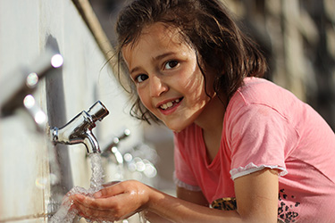 © UNICEF Syrian Arab Republic/2016/Al Issa | Alaa, 9, drinking clean water supported by UNICEF WASH programmes. When the fighting broke out in her neighbourhood, she ran for her life. She and her family are now staying with their relatives who have 10 children, living in a couple of rooms.