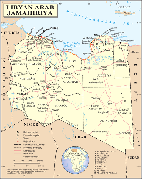 **United Nations Map of Libya, with cities, roads, and the current twenty-two Districts or Shabiyah of Libya. | This image is a map derived from a United Nations map. | Public Domain | Wikimedia Commons