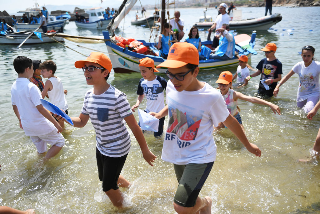 Italian Coastguard, children, volunteers and officials take part in a symbolic rescue of paper boats to send a message to the G7 leaders to take action to safeguard children on the move off a beach in Palermo, Italy, on Thursday, 25 May 2017. Photo: UNICEF/Salvatore Cavalli