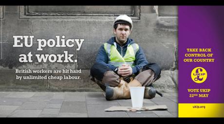 A UKIP poster shows a British white man begging in the street. Where are the women?