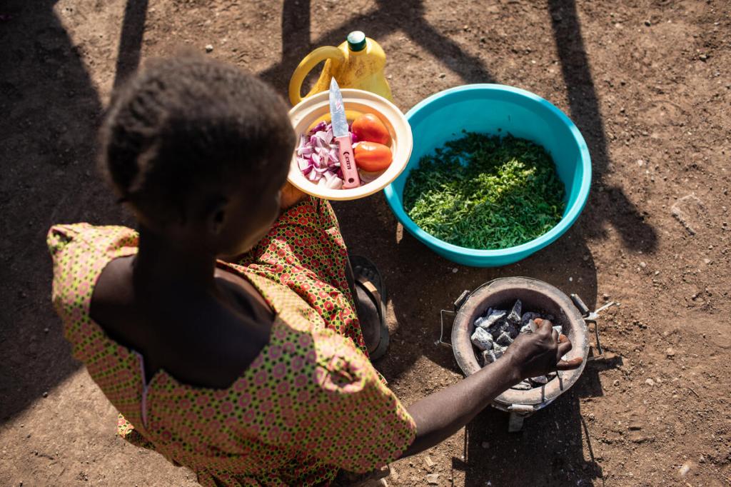 **Kalobeyei refugee settlement, Kakuma, Turkana County, Kenya. Mary Bate Edward prepares food for her children with vegetables from the horticultural farm where she works. Mary Bate also received a training in nutrition.