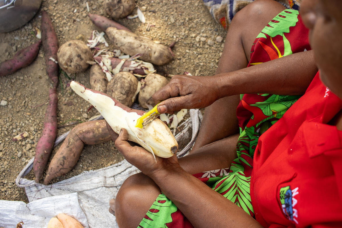 **Papua New Guinea – A woman participating in a farmers’ group in Rigwali prepare freshly harvested sweet and starch potatoes for cooking.